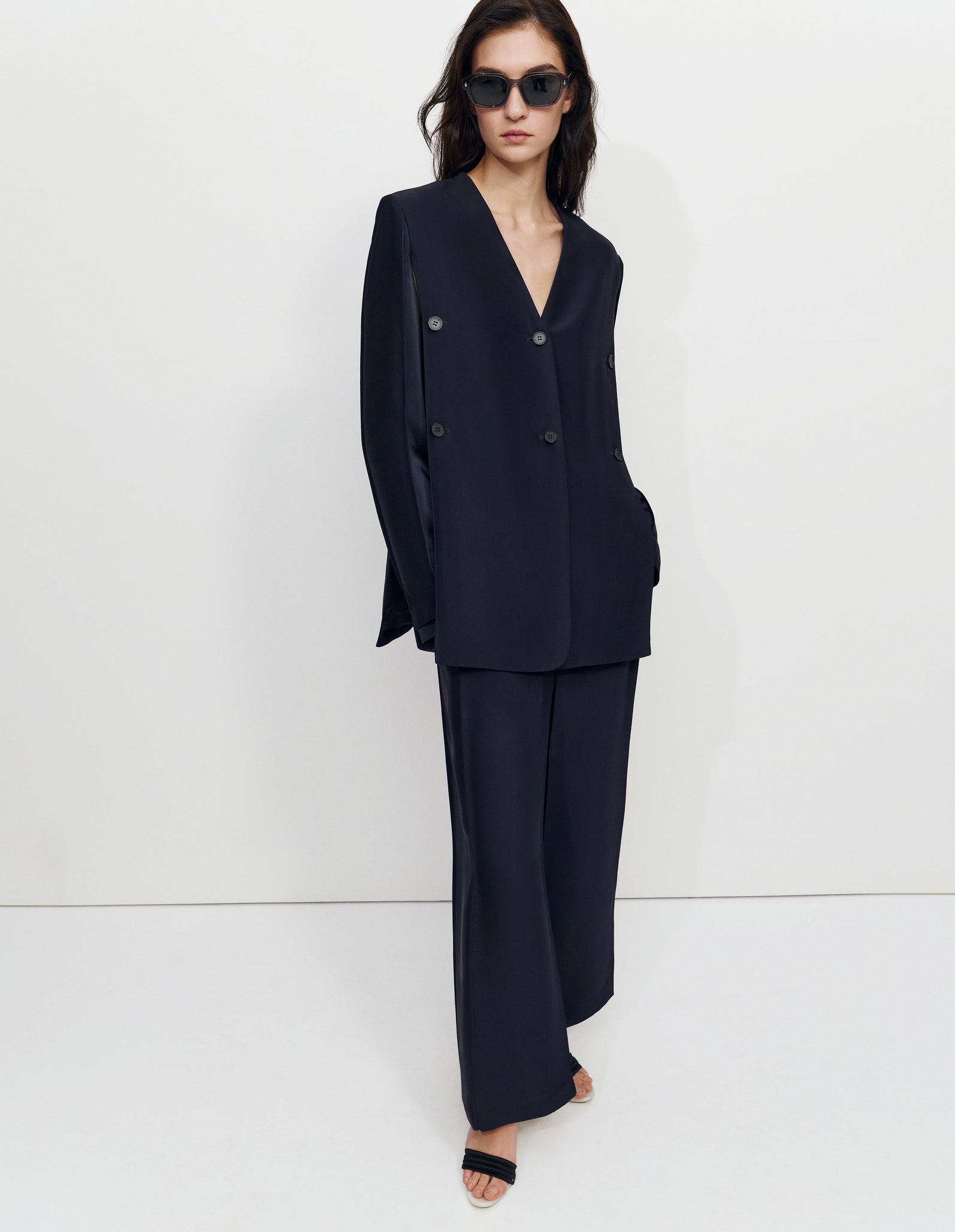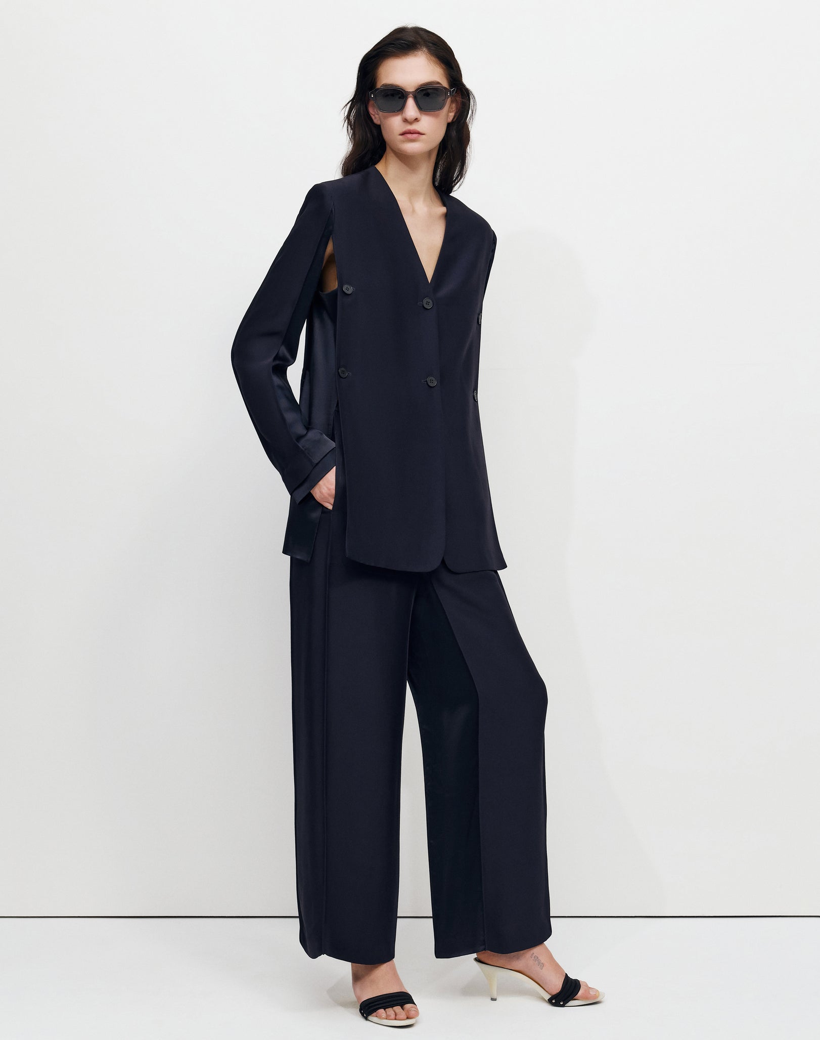 Широкі брюки-кюлоти з напівприталеним силуетом, виготовлені з комбінації глянцевої та матової віскози, з еластичним поясом і двома бічними кишенями.