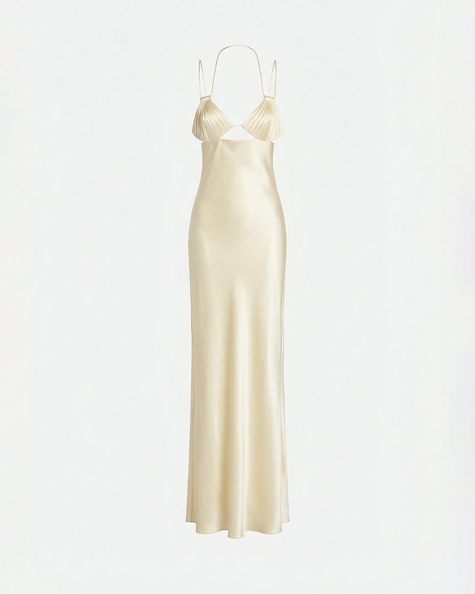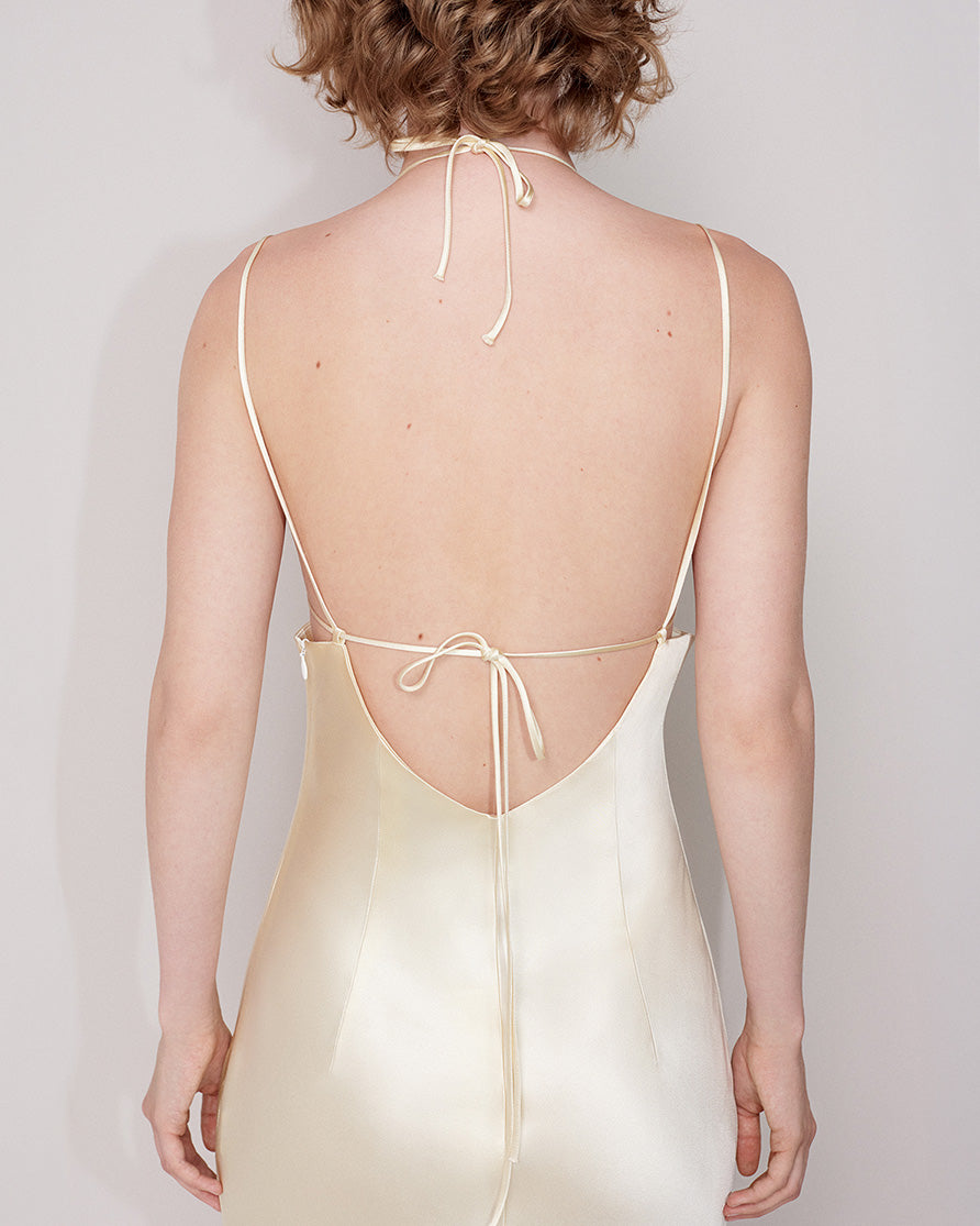 Приталена довга сукня на зав'язках із чашками у формі мушлі, відкритою спиною та прихованою бічною застібкою-блискавкою.