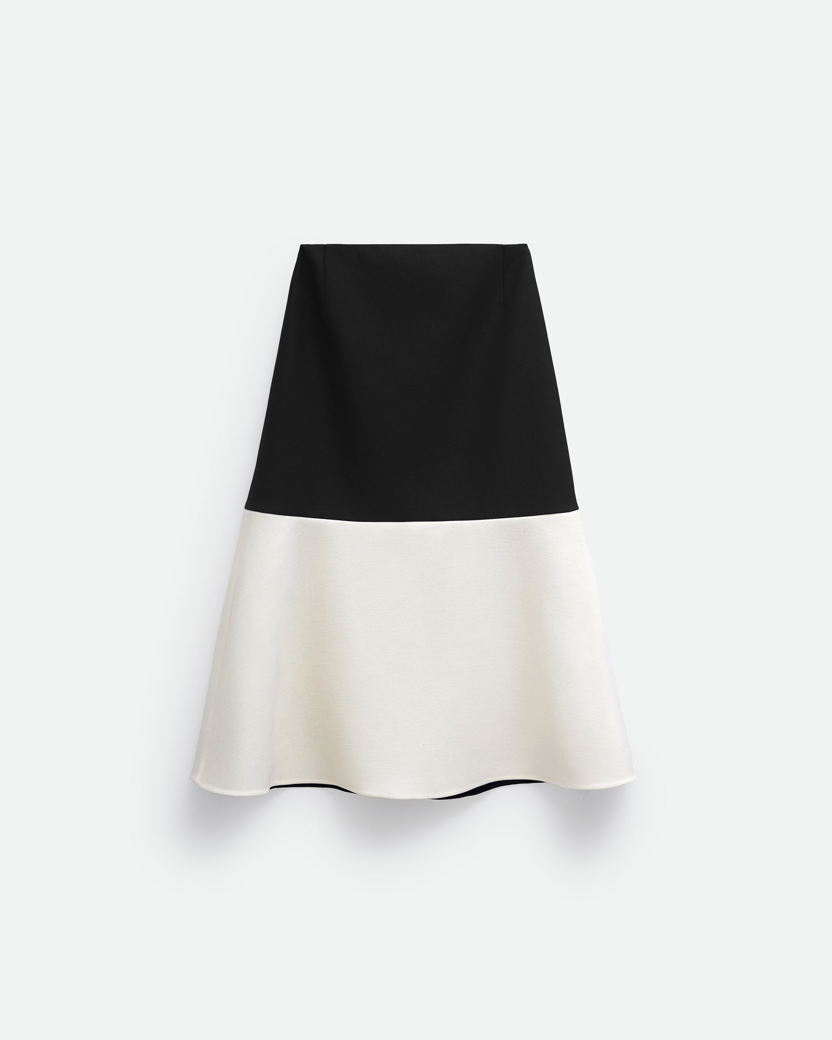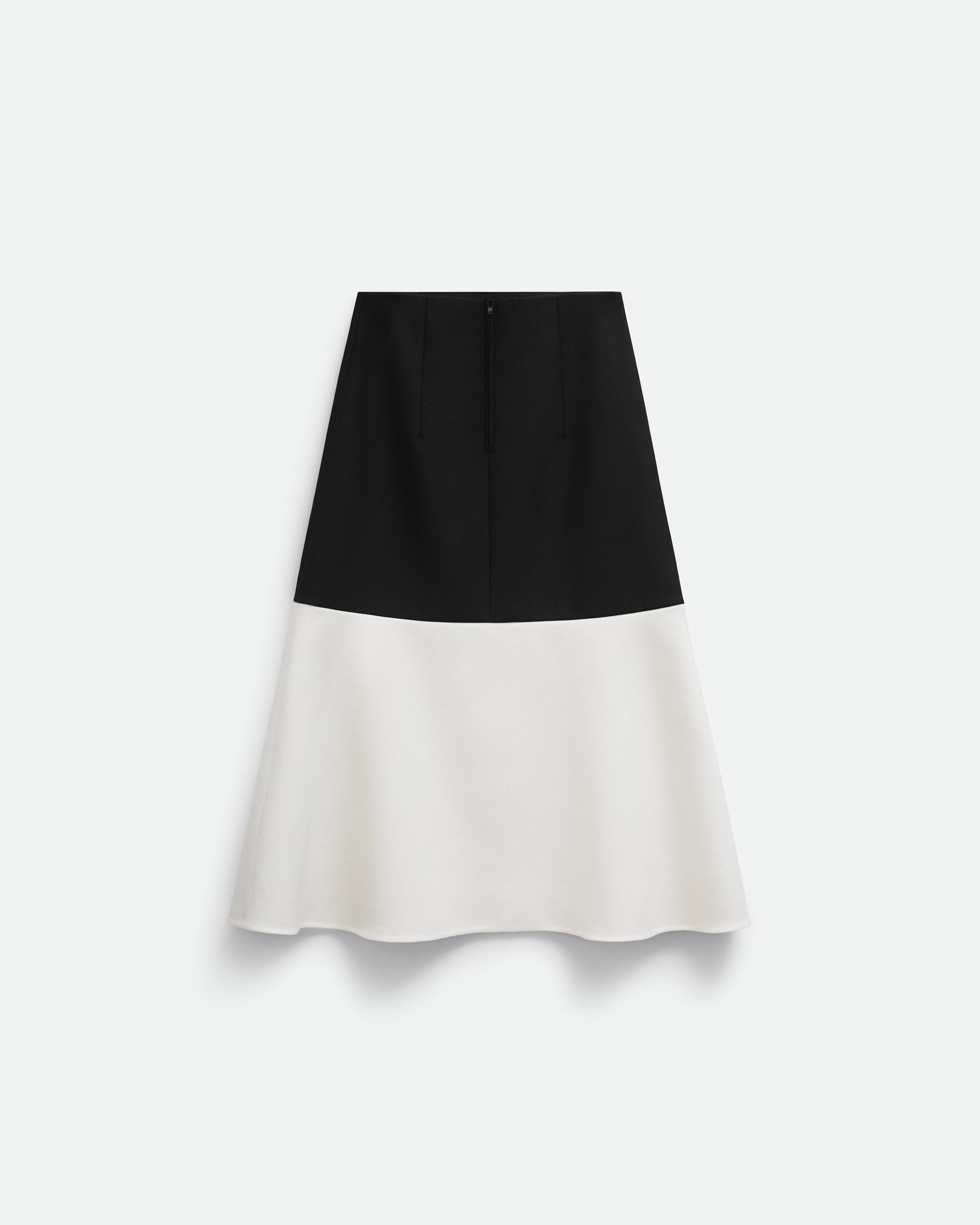 Двоколірна спідниця годе довжиною вище щиколотки. Силует м’яко розширюється донизу, створюючи плавний рух та збалансовану форму. Застібка-блискавка ззаду забезпечує акуратну посадку та комфорт у носінні.