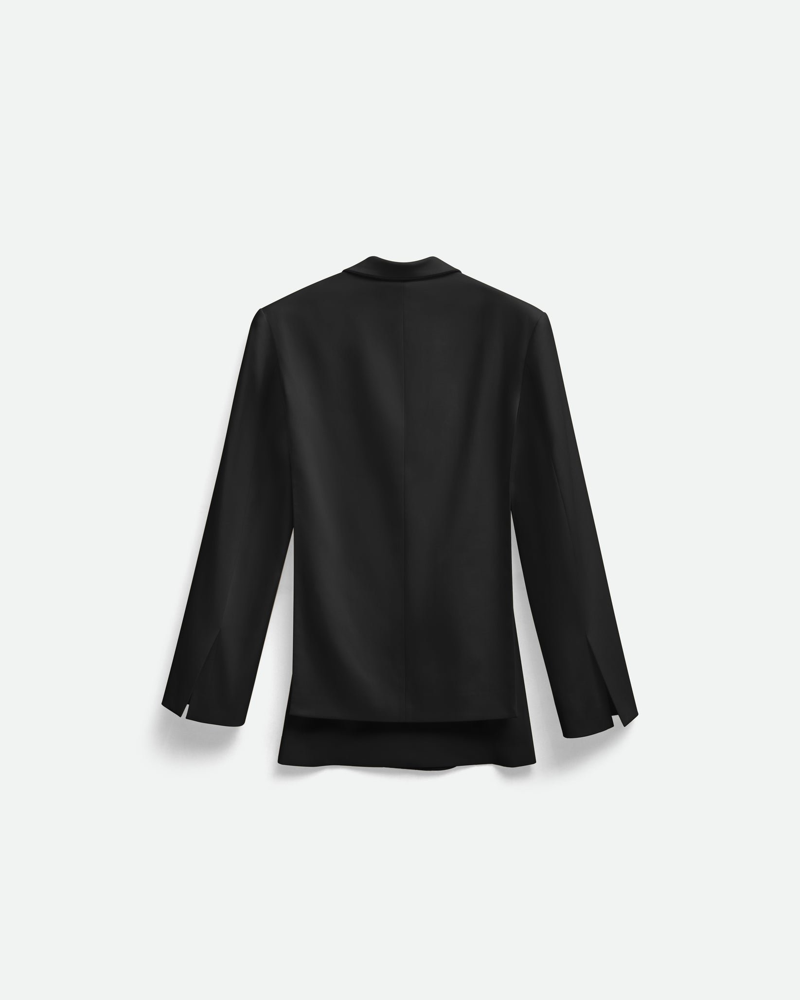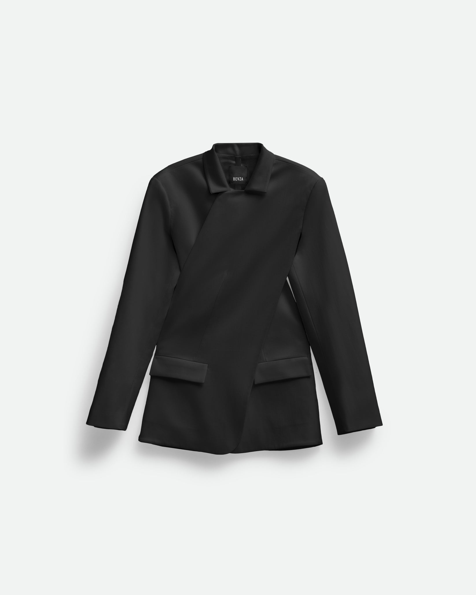 Піджак з коміром-стійкою, перехресною передньою застібкою та акцентними боковими вирізами.