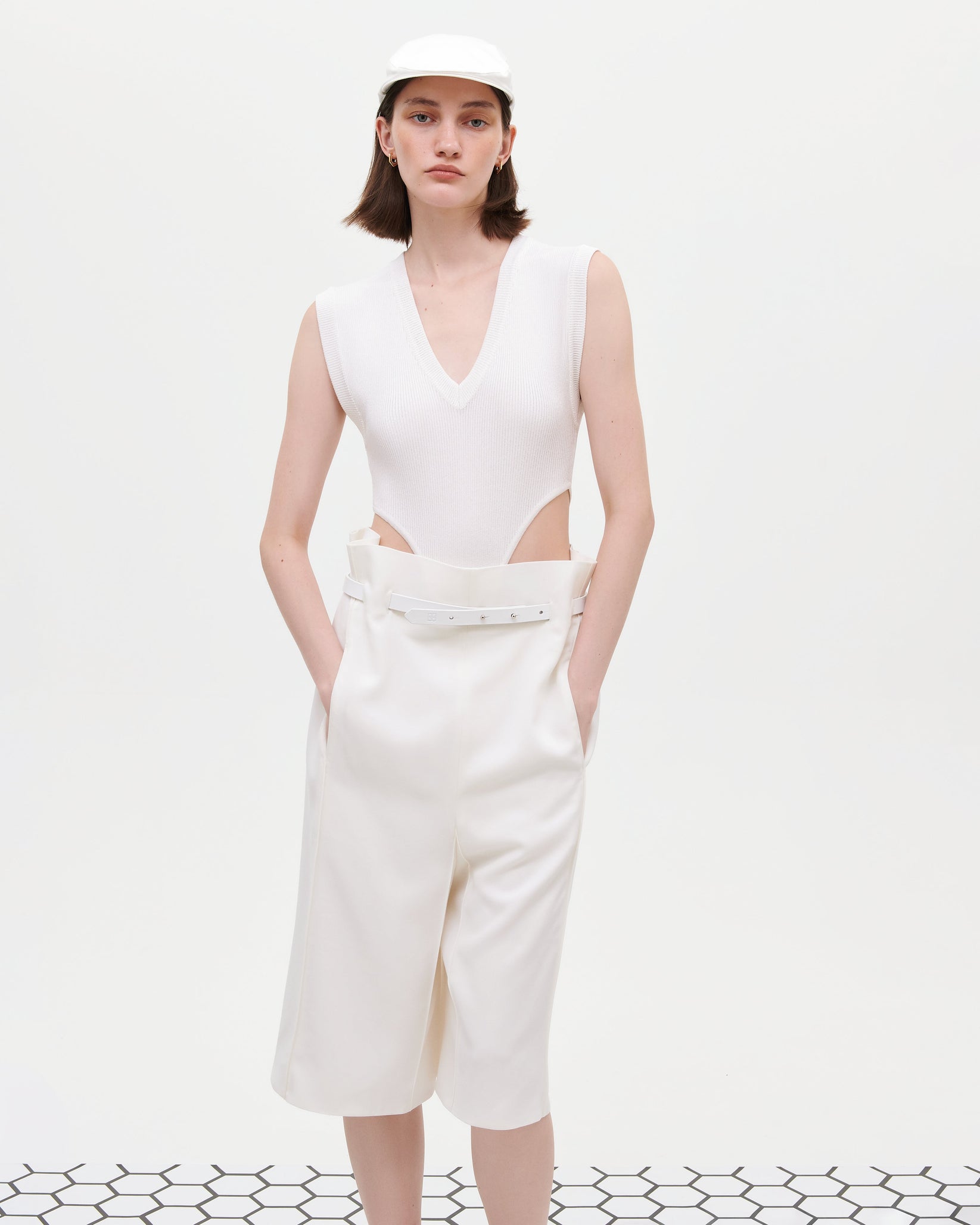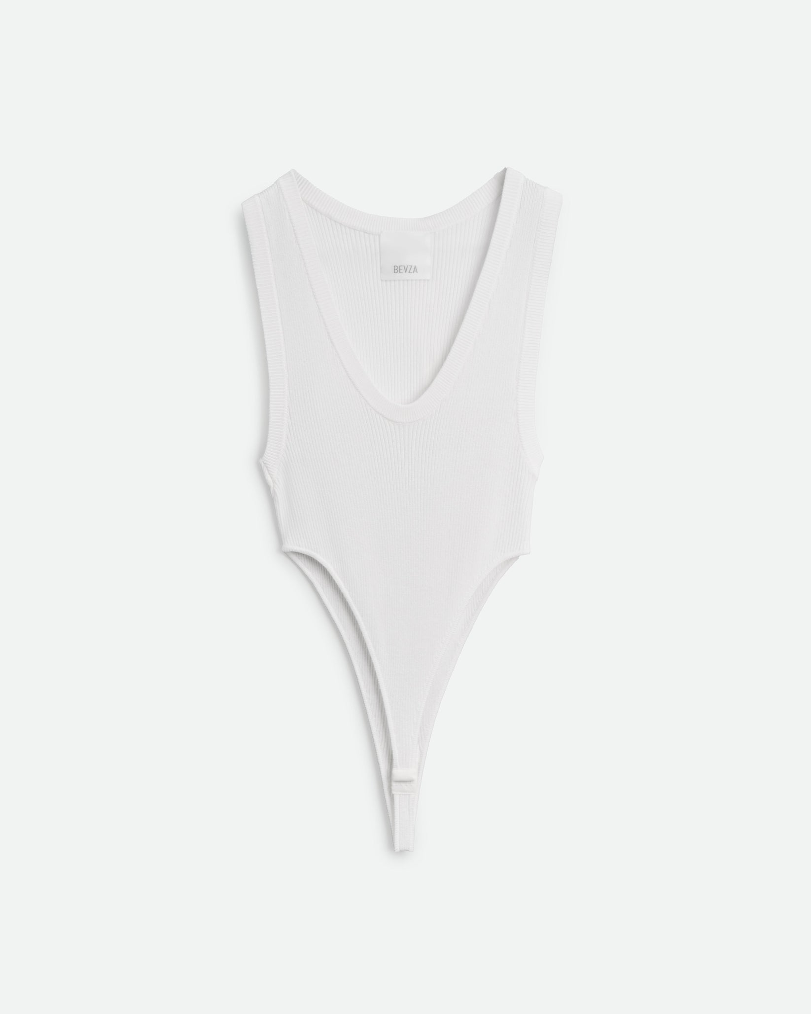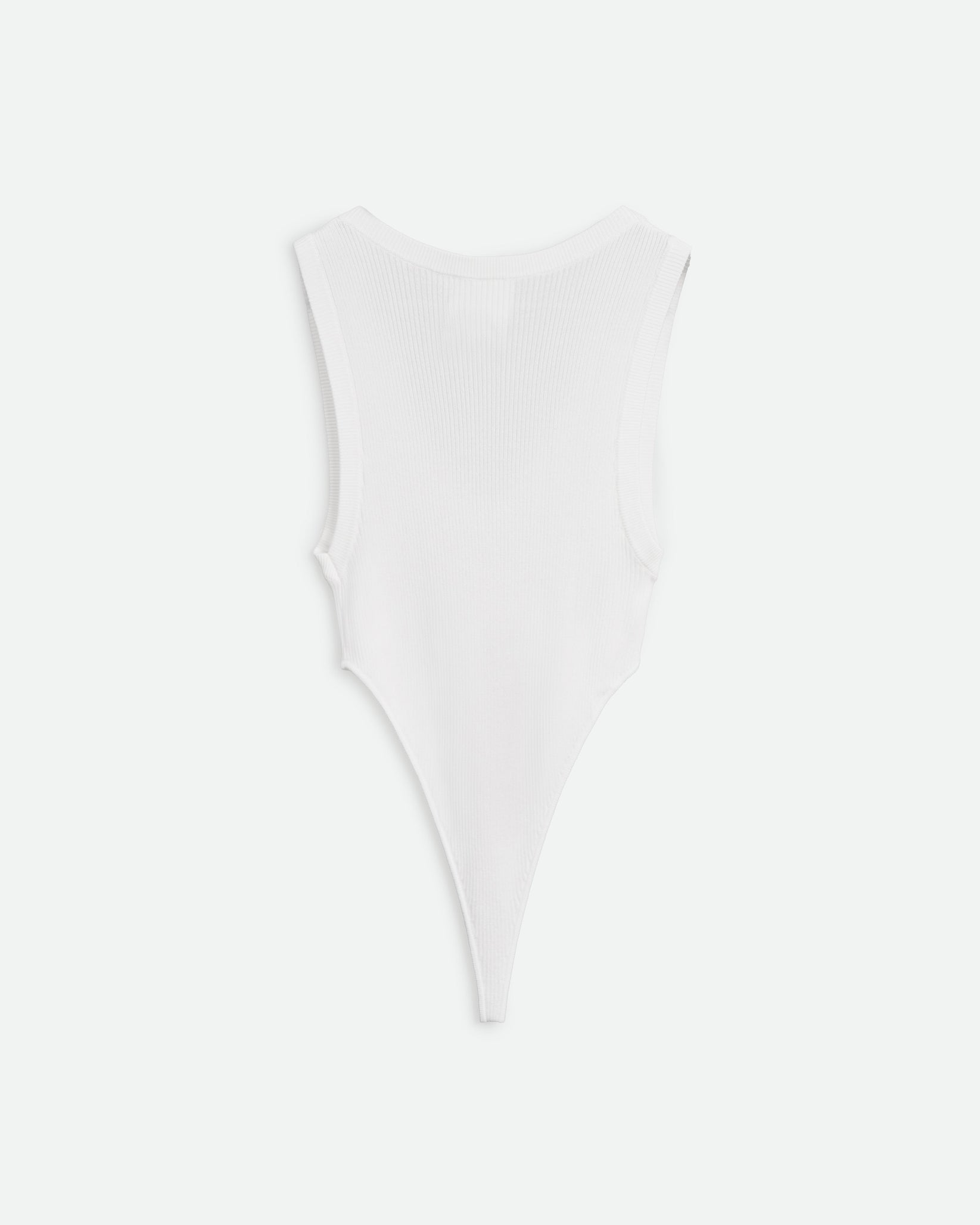 Приталений боді з гладкого еластичного трикотажу з V-подібним вирізом та застібкою внизу.