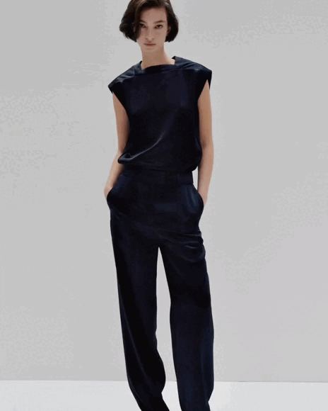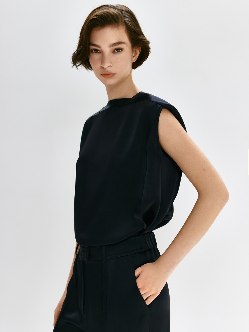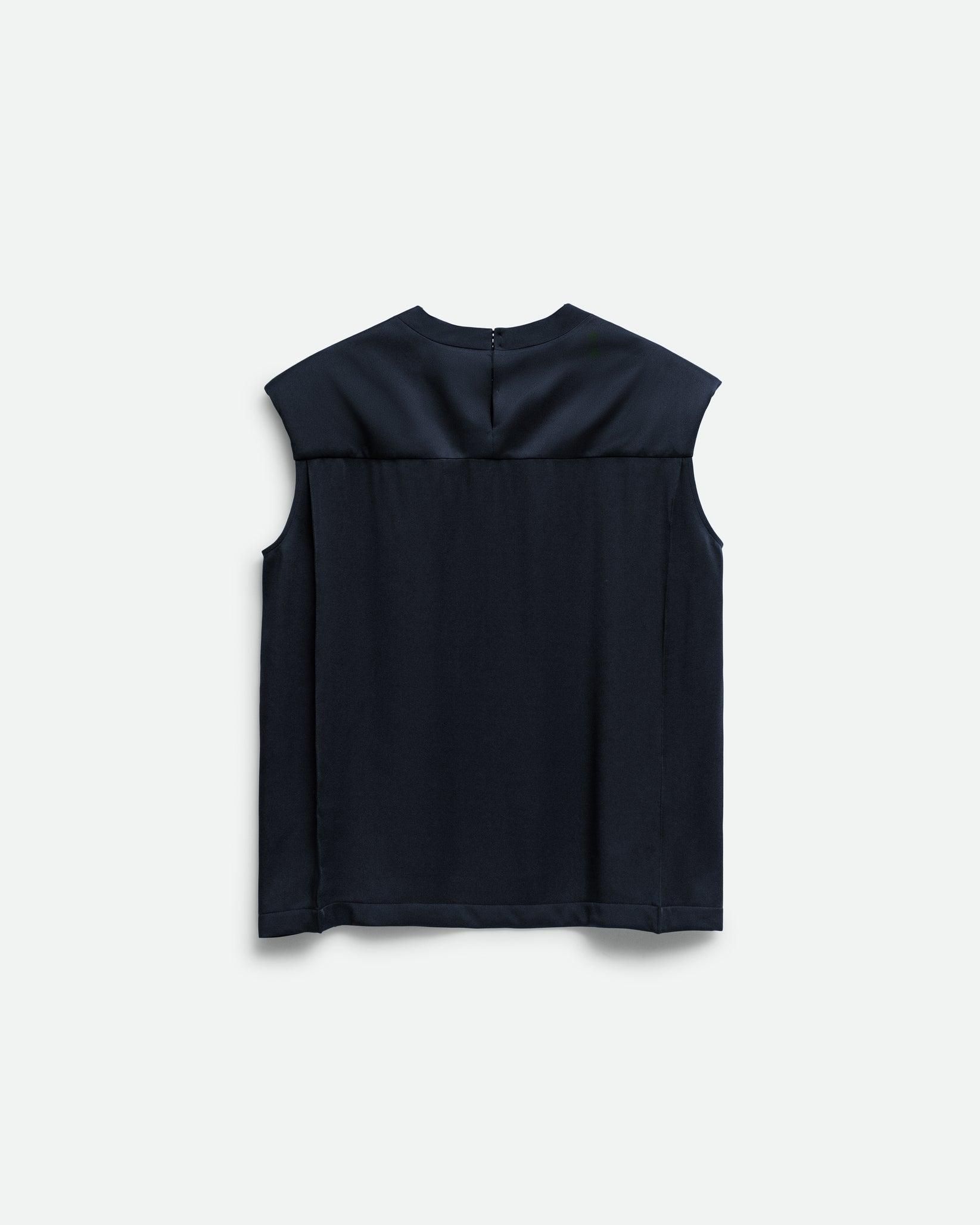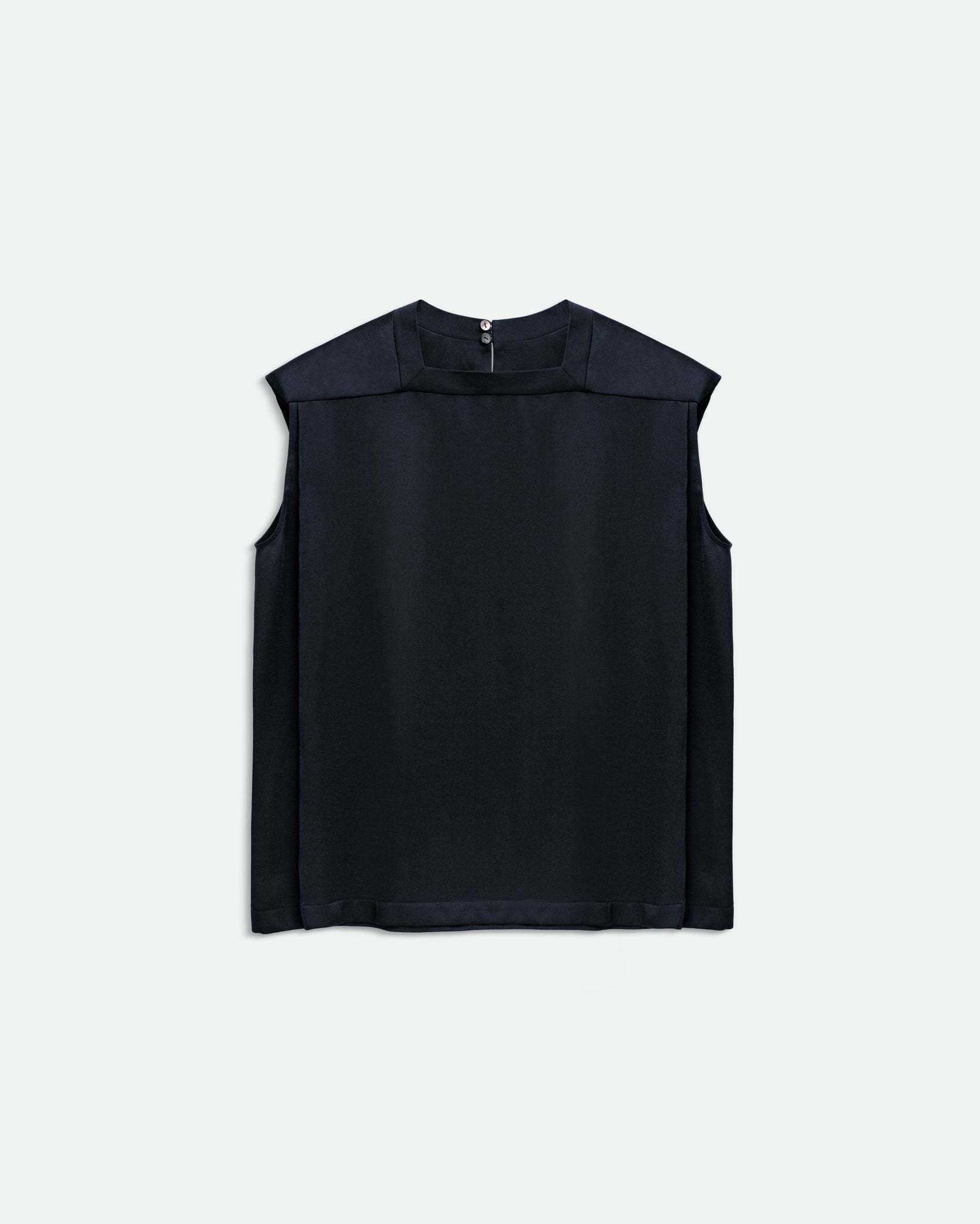 Блуза без рукавів вільного крою з м'якого атласу з підкладками на плечах і квадратним вирізом.