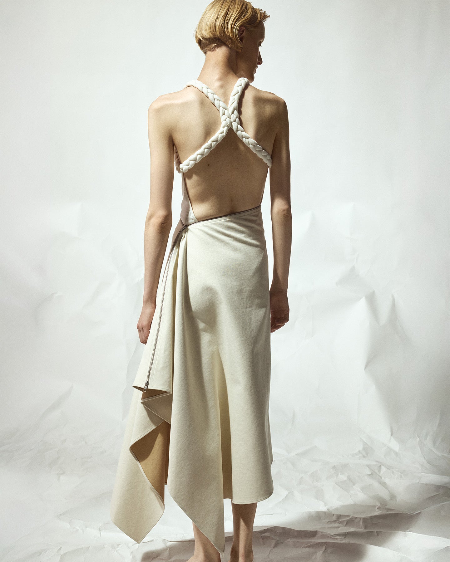Довга асиметрична драпірована спідниця, пошита з одного квадратного полотна, сконструйована так, щоб огортати та застібатися на талії за допомогою бічної блискавки, створюючи каскадне драпірування.