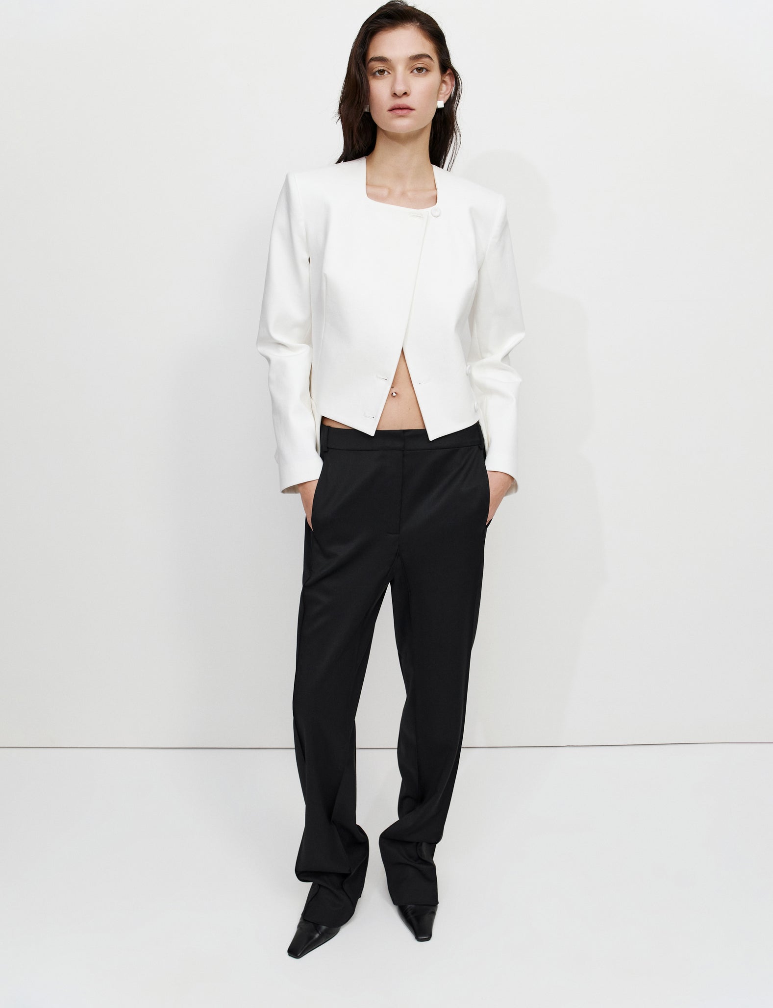 Костюмні брюки з напівприталеною посадкою, прямим кроєм та чотирма швами для квадратного силуету, з боковими кишенями.