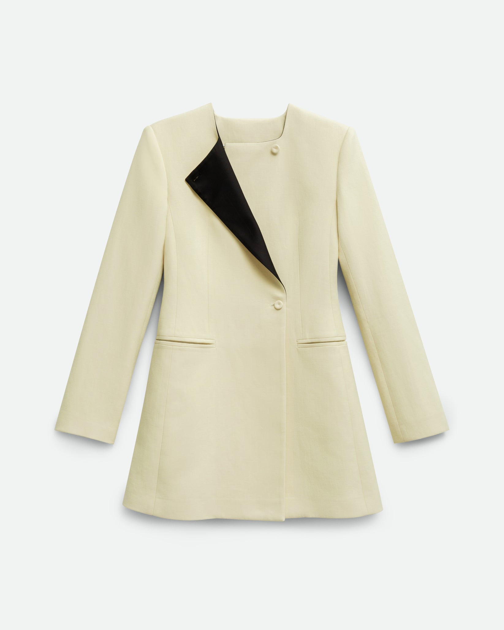 Приталений довгий жакет зі структорованими плечима, передньою застібкою на ґудзиках та контрастним боковим лацканом.