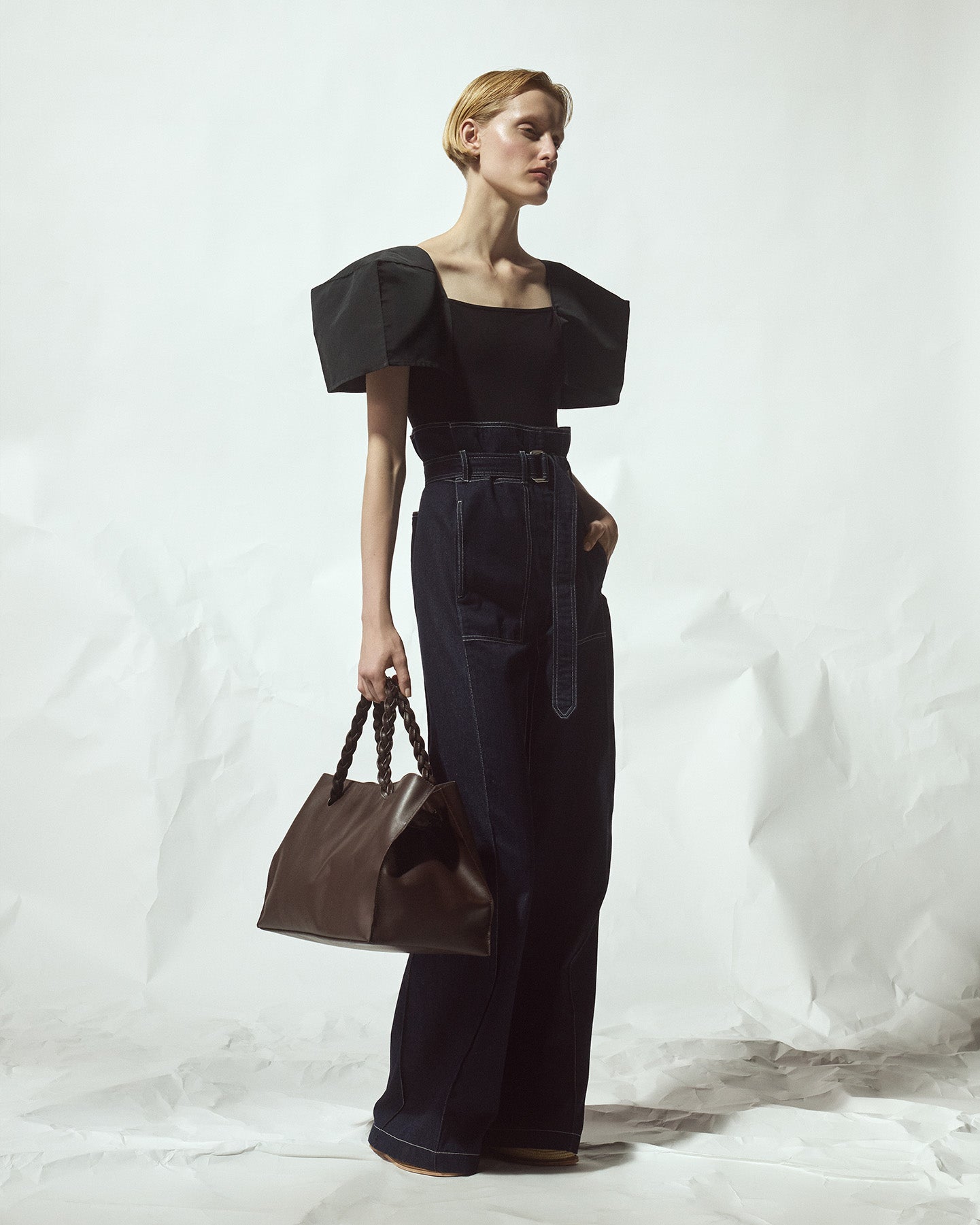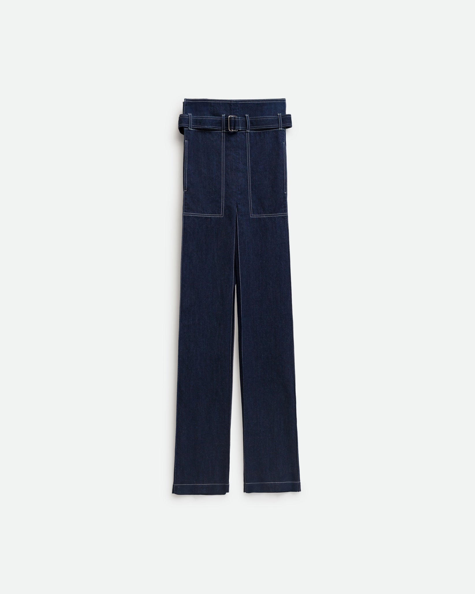 Високі квадратні джинси вільного крою, з поясом на талії та передніми кишенями.