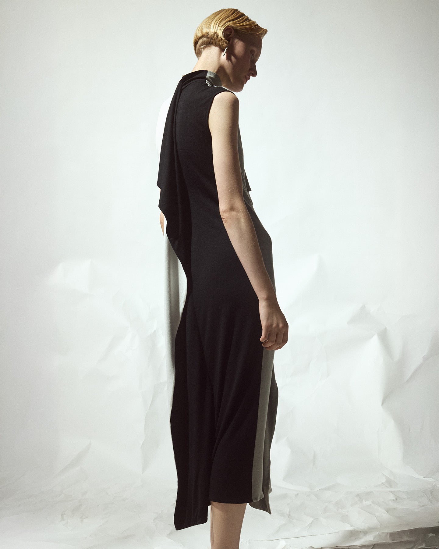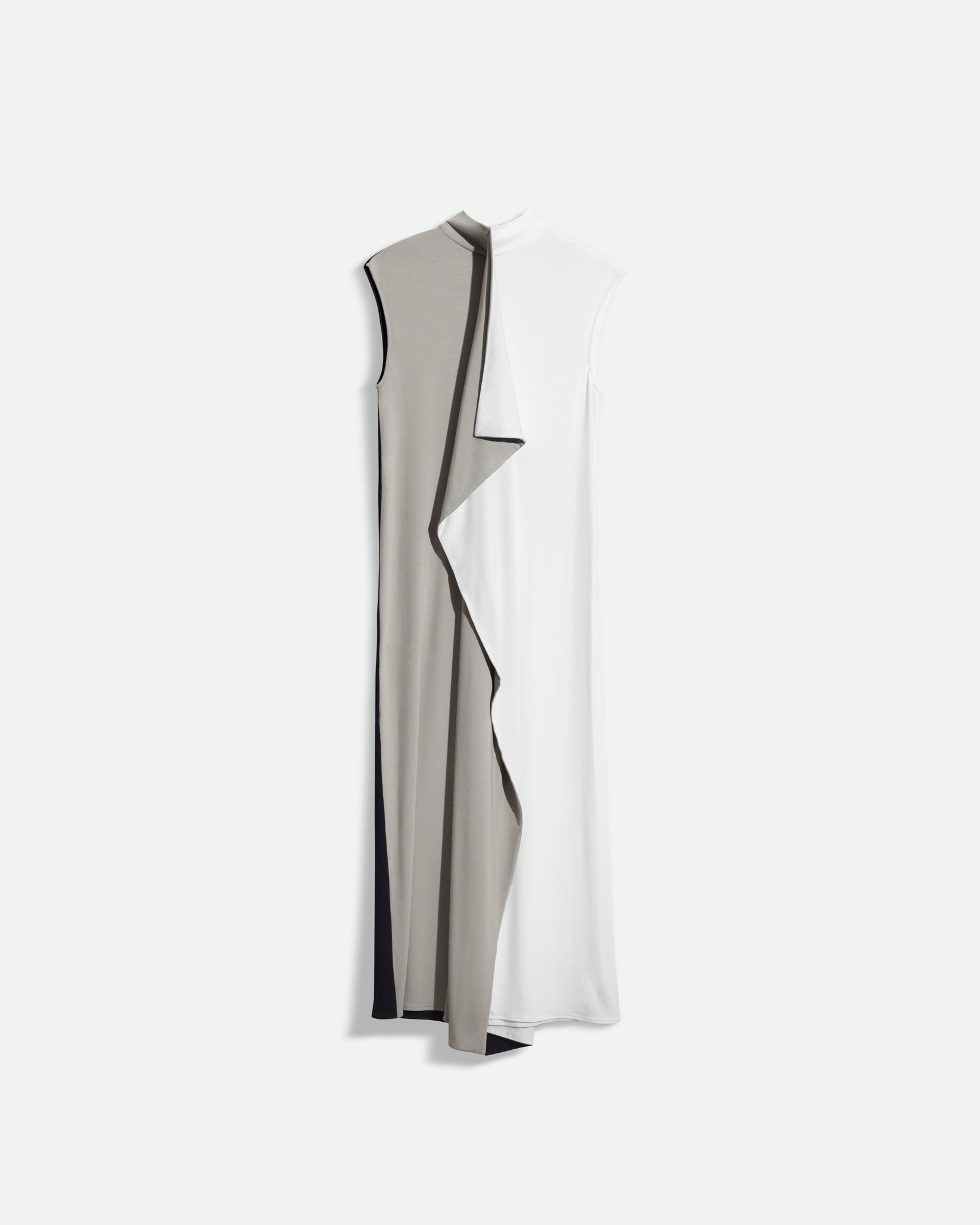 Триколірна сукня без рукавів середньої довжини з високим коміром, пошита з трьох контрастних квадратних деталей, що створюють скульптурне драпірування спереду.