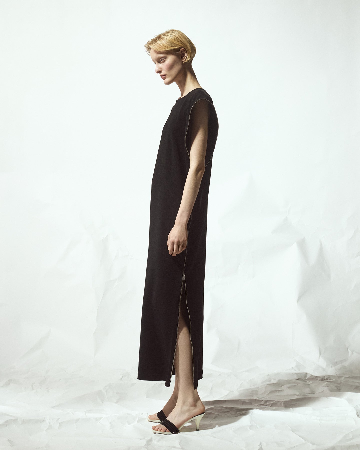 Довга сукня, пошита з двох квадратних деталей, з подвійними бічними блискавками для регулювання розрізів і багатофункціонального фасону.