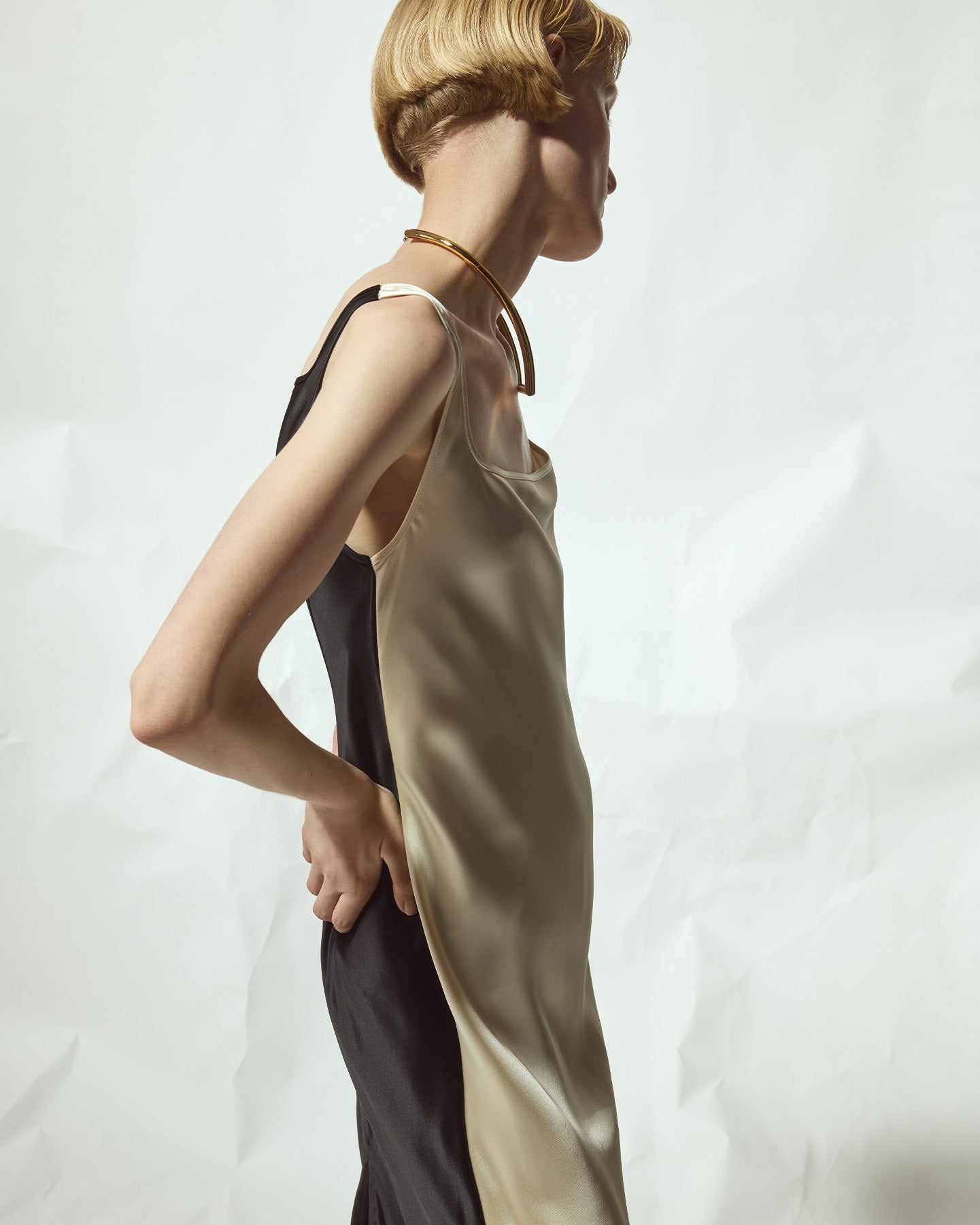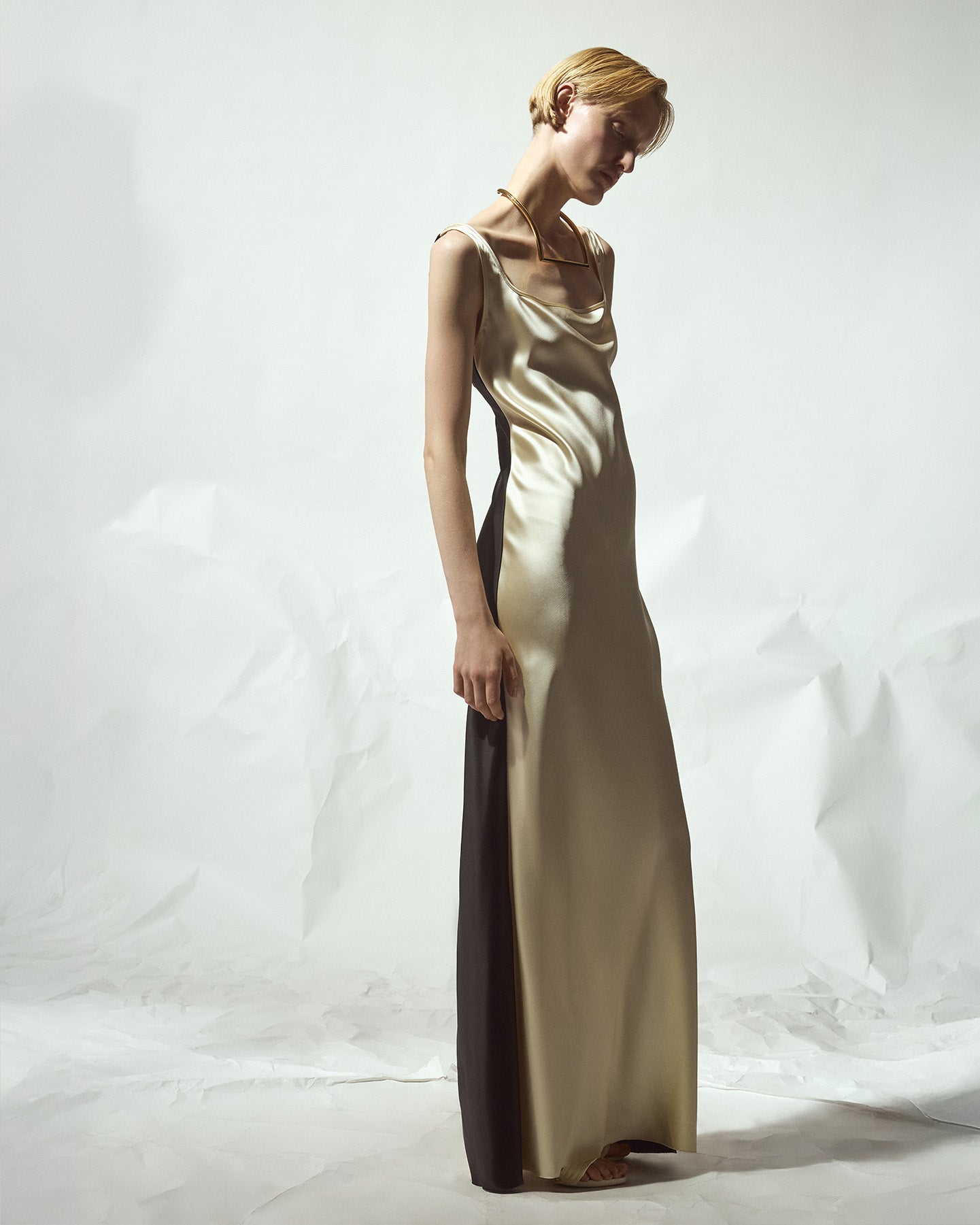 Сатинова сукня-максі з квадратним вирізом, пошита з контрастних чорно-білих деталей.
