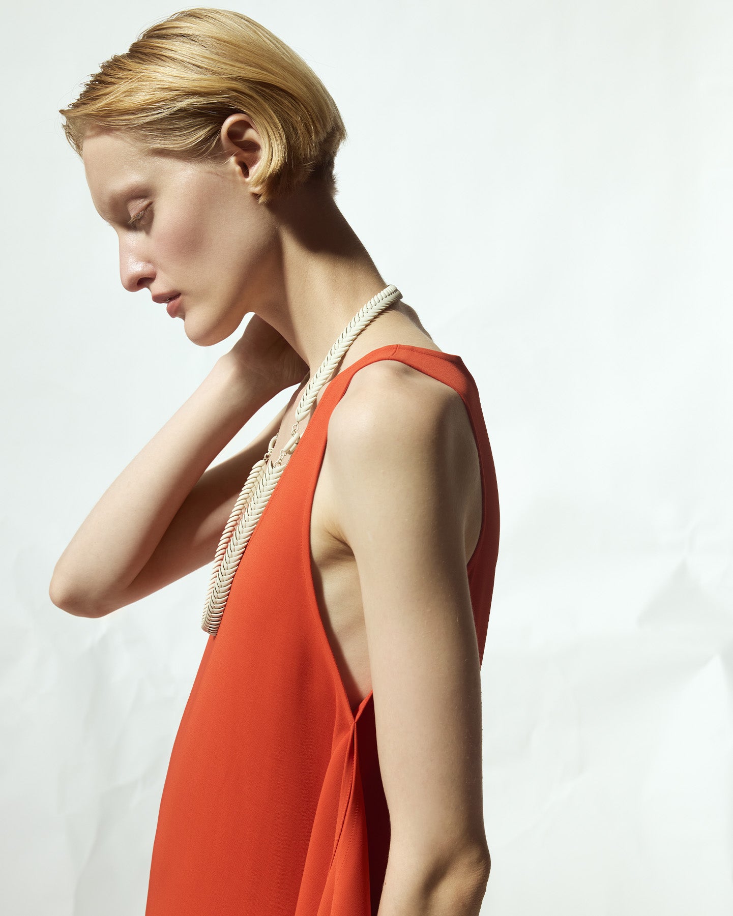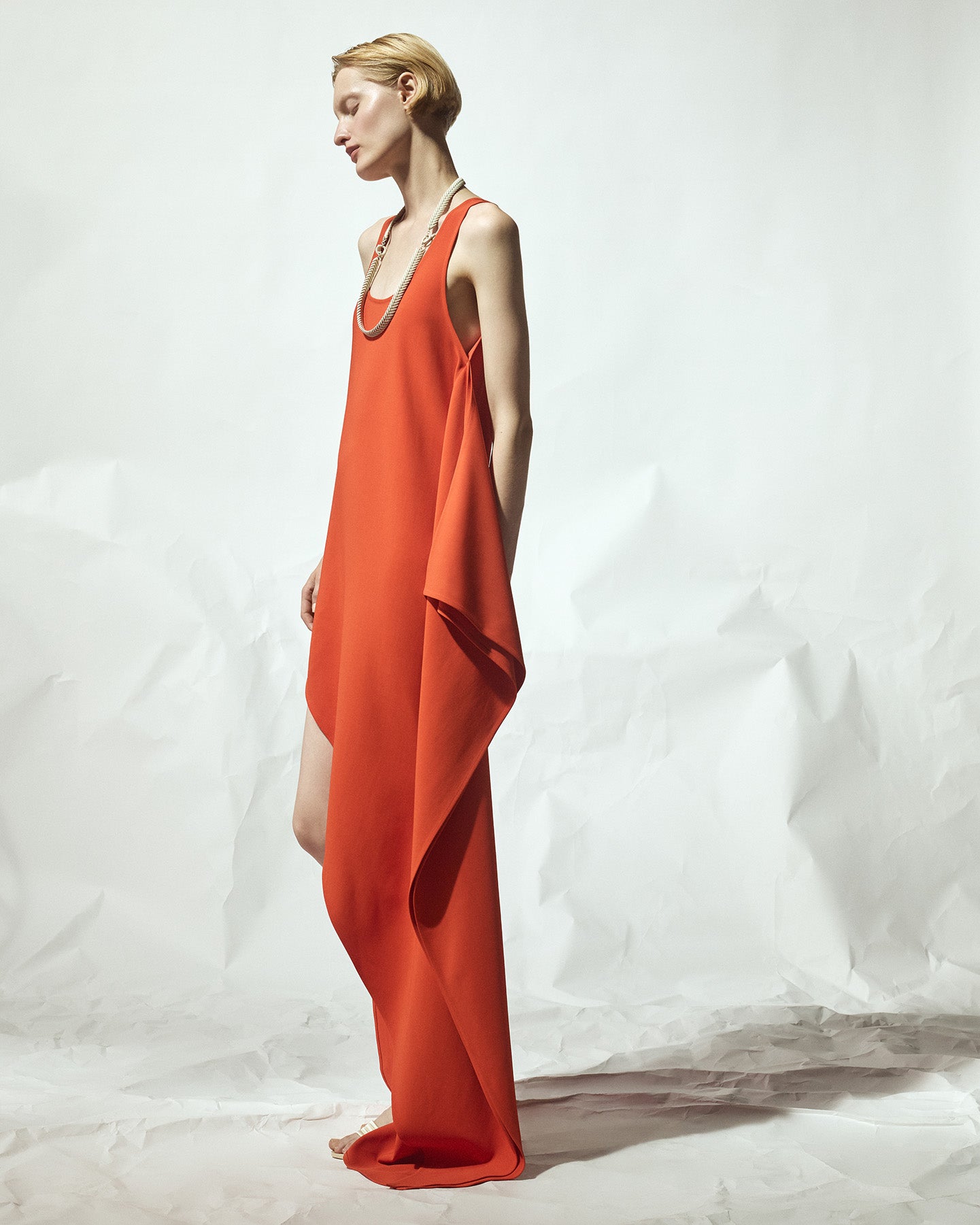 Сукня-максі без рукавів з круглим вирізом, пошита з двох квадратних деталей, зі скульптурною драпіровкою з одного боку і асиметричним кроєм спереду.